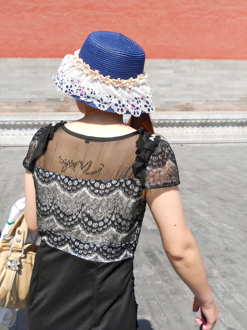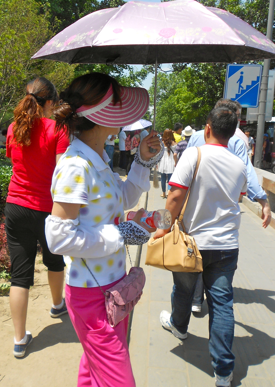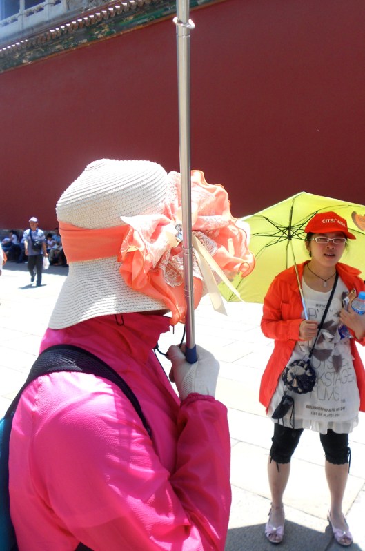 A beauty by the Forbidden City in full Beijinger Anti-Sun regalia – her tan line should be interesting.
