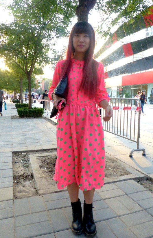 Beijing Street Style, belle du jour, Chinese fashion, day-glow, Dr Martens, Fashion in China, polka dots, robe à pois, Sanlitun Village, Think Pink