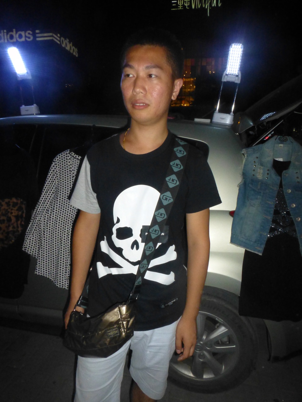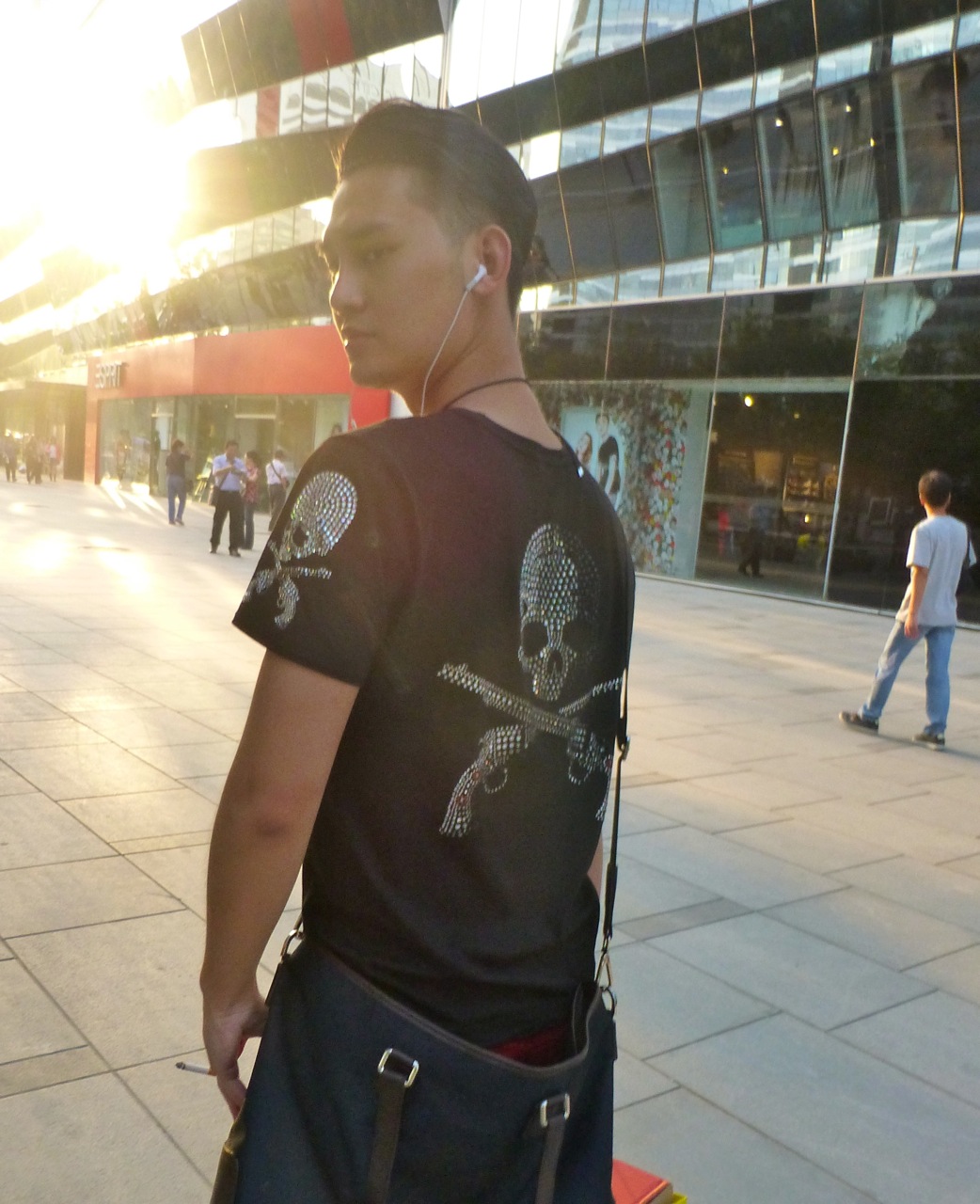 Probablement le sac en skaï le plus laid de Pékin, notez le crâne en vadrouille… Probably the ugliest fake bag in all of Beijing..but the t.shirt had the skull….