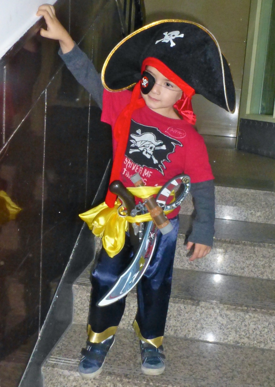 So young and so fashionable! I have NO idea how this scary pirate got dressed like that. None!