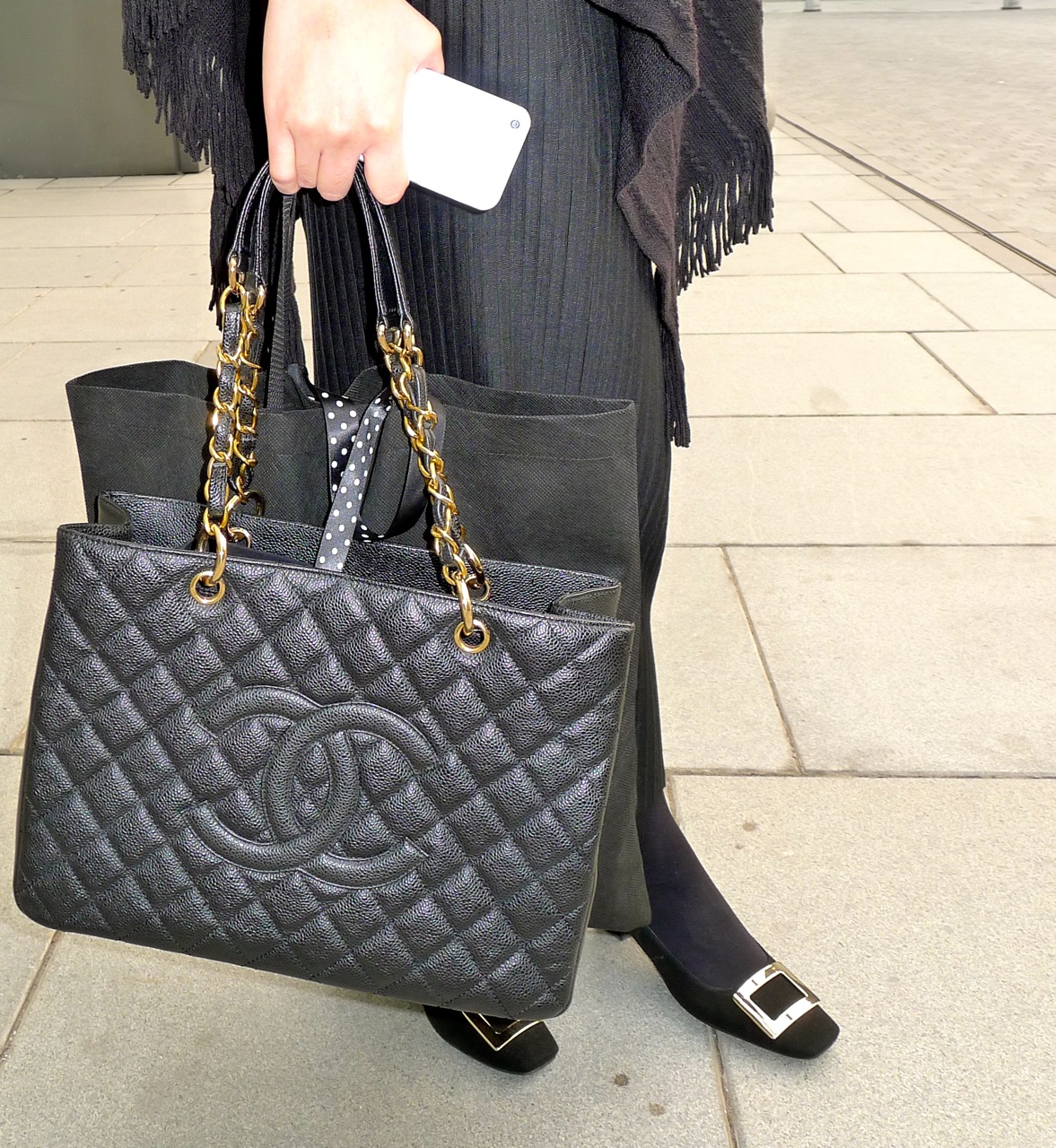 Ok, so there I liked their long black silhouettes (I am seeing those more and more) so I did not immediately register that they were actually wearing the same thing! One was « bling’ed » up with the Roger Vivier shoes, her Chanel bag, the Chanel Sunnies. Her friend was slightly more subdued with sparkly/mink lined shoes, and the no-brand pink bag. But…Their clothes were identical. They told me they find that « pretty cool and funny ». Oh? – OK then.